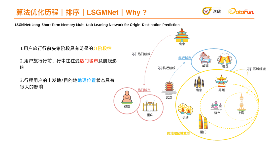 临近城市,也会影响用户的决策。假设从家里去青岛旅游,因为青岛、威海、蓬蓬莱这三个城市离得比较近,先去青岛,威海或者蓬莱,下一个去哪对我们来说意义不大。影响我们心智的无非是价格或是交通的便捷性,这就导致了邻近城市的推荐会出现相互的影响性。所以如何建模邻近城市的相互影响性也是十分必要的。 -