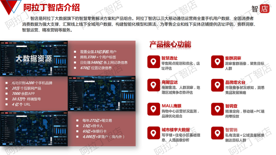 智店是阿拉丁大数据推出的一款智慧店铺解决方案。智店以运营商的手机用户大数据、消费者大数据、商圈大数据、网民上网行为特征大数据为依托,构建智能化模型和算法,为零售企业和线下实体店铺提供店址评估、客群洞察、智慧运营、精准营销等服务。