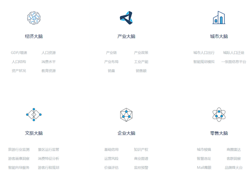 阿拉丁大数据开发了六大智能平台,分别是经济大脑、产业大脑、企业大脑、城市大脑、旅游大脑和零售大脑。