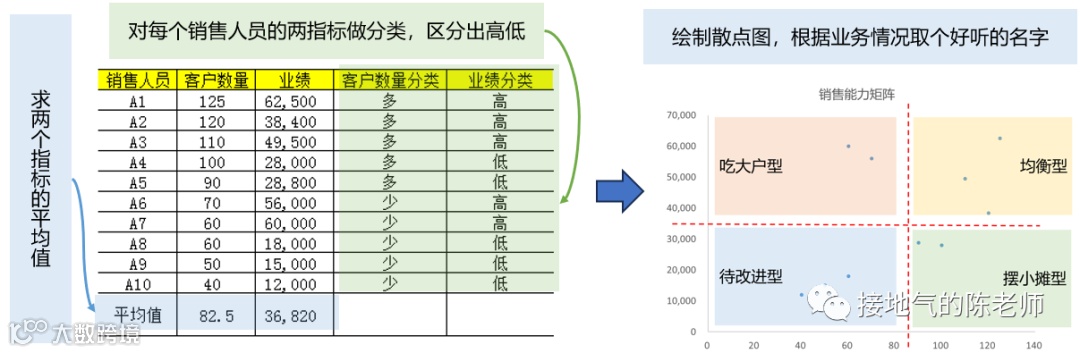 找好指标以后,计算平均值,对业务分类,或者直接用做散点图+平均值标识线,做出矩阵效果,比如用开发客户数+客户付费构造一个销售人员能力矩阵,可以如下图操作。