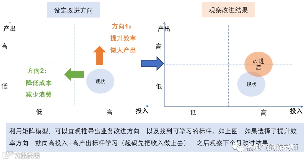 矩阵模型的好处,就在于改进效果是直接呈现在纸面的,如果我们看到一个业务投入高+产出低,本能就会想:是不是能砍一点无效投入/是不是能优化一下产出效率。此时可以设定改进方向,然后持续观察改进效果,这样就能推动业务的进步(如下图)。