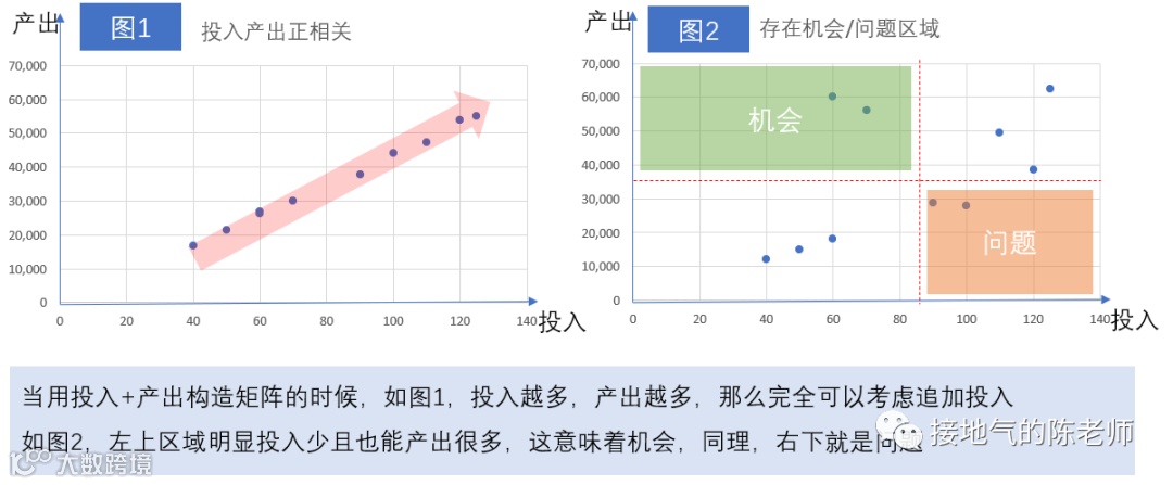 形态2:投入产出指标不成正比(上图2)。这时候,左上、右下2个不符合常规认知的区域,就是重点研究对象。
