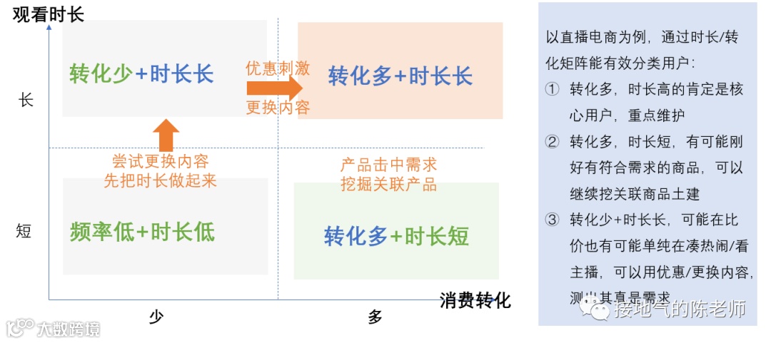 比如直播电商做用户行为分析,可以用:观看时长 + 消费频次做矩阵,从而找出哪些只看不买(观看时长很长+消费很少)的用户做进一步营销。