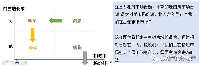 这就是矩阵模型的本质:用2个不相关的关键指标,衡量业务表现,从而发现问题/机会点。比如经典的波士顿矩阵,就是利用:产品销售增长率+产品市场份额,两个指标进行衡量。如果自身增速慢,但是市场份额很高,已经缺少进一步增长空间,那就不要“鞭打快牛”,而是多找其他机会,这样的评估更全面(如下图)。