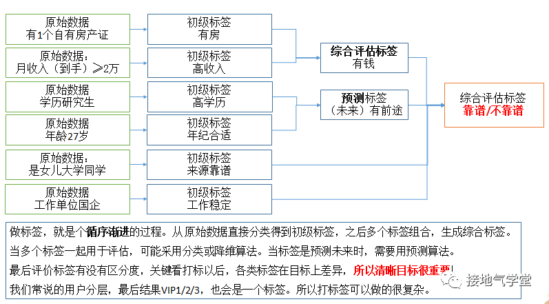 因为单一维度的标签,信息量很有限。就像单纯说“有房”,那到底是上海的房子还是盐城的房子,是60平小两房还是120平大三房,是全款的还是欠了一屁股债的,统统不知道。因此,丈母娘才会问一大堆信息,逐步规整判断到底这个小伙靠不靠谱。