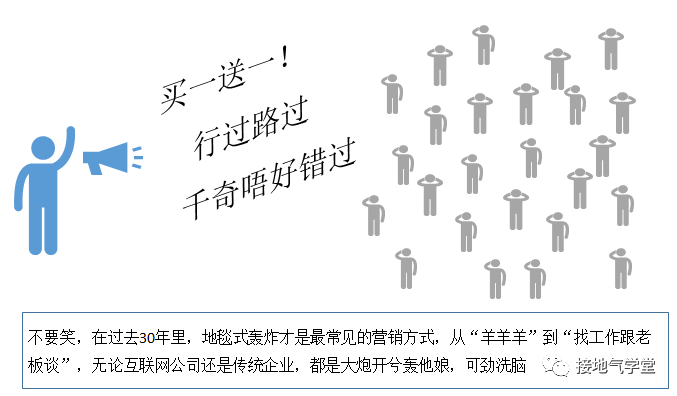 因为面对一个人,出于尊重他人、不带偏见的考虑,我们说不能乱贴标签。但企业经营面对数以千万的用户,就不能一个个去理解,时间和成本都烧不起。如果不加区分,把所有顾客一视同仁,就只能这么地毯式轰炸(如下图所示)