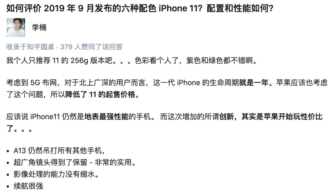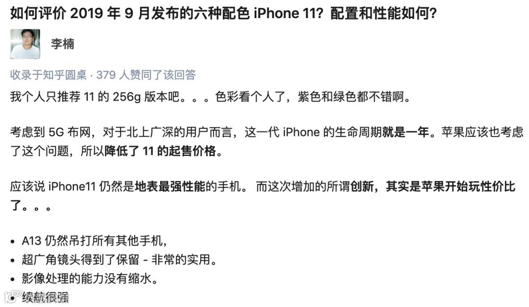 李楠还在知乎这样评价「 iPhone 11 仍然是地表最强性能的手机。 而这次增加的所谓创新,其实是苹果开始玩性价比了。。。但遗憾也不少,所以基本上可以把 iPhone11 看作一个 5G 时代将要到来的最优过渡机。」