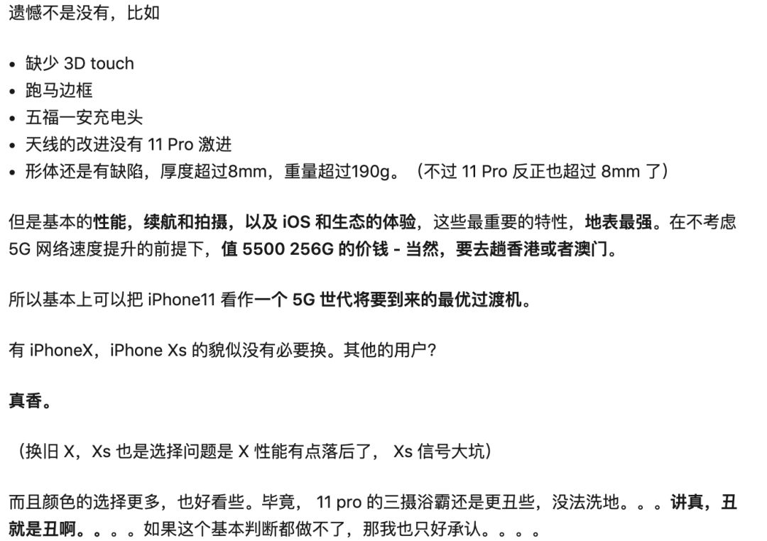 并总结「在不考虑 5G 网络速度提升的前提下,值 5500 256G 的价钱 - 当然,要去趟香港或者澳门。而有 iPhoneX,iPhone XS 的用户貌似没有必要换。其他的用户?真香。毕竟, 11 Pro 的三摄浴霸还是更丑些,没法洗地...讲真,丑就是丑啊。。。」