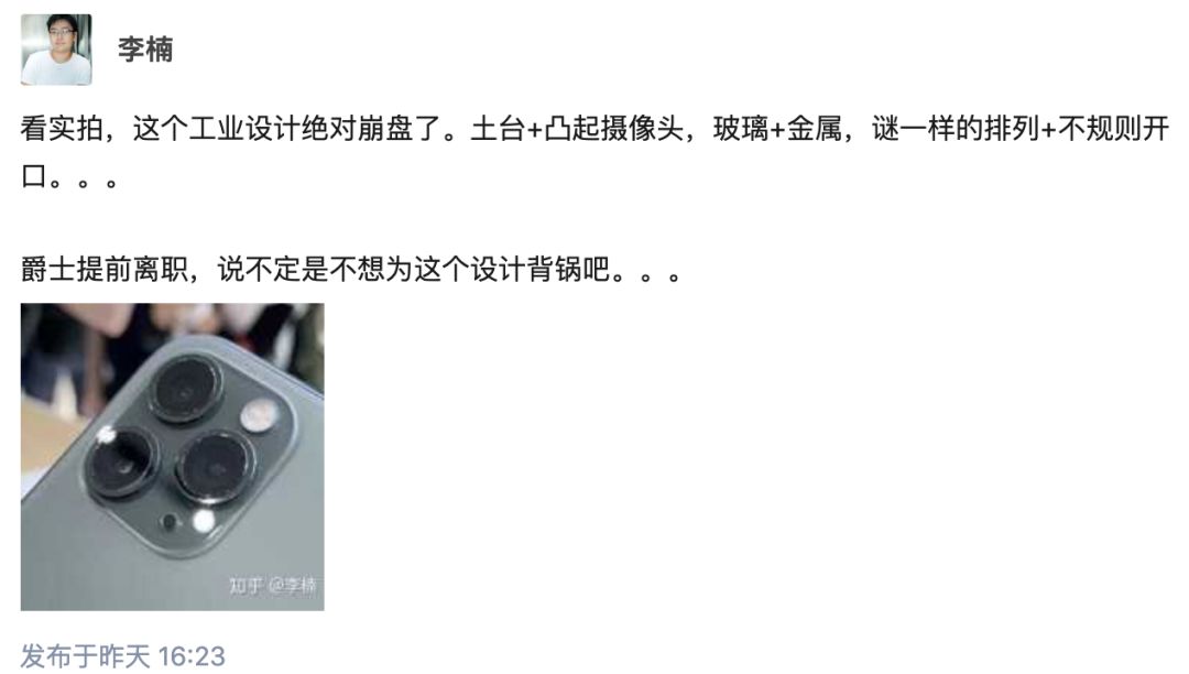 如上图所见,李楠评价iPhone 11 Pro:「工业设计崩盘,土台+凸起摄像头,谜一样的排列,不规则开口。。。」