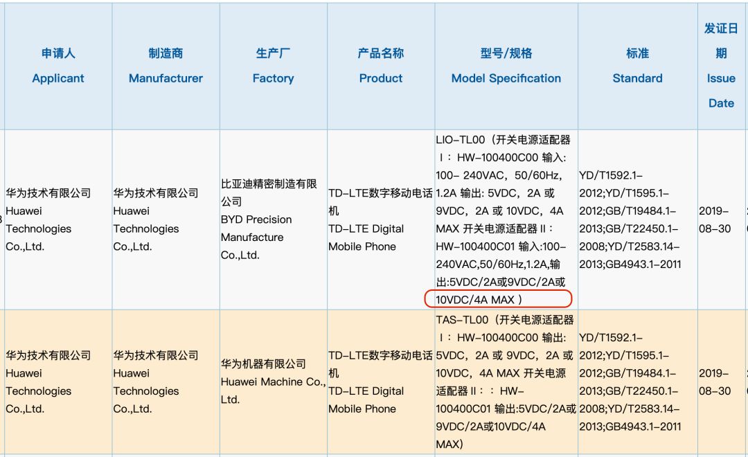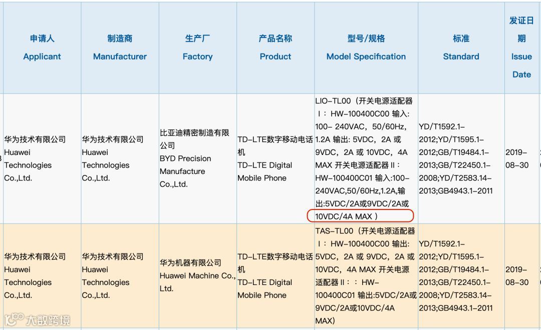 3C认证显示,这两款华为新机配备最大10VDC/4A MAX 40W快充,也因此被大家猜测为华为Mate 30系列。如果型号没错的话,也间接说明华为MateX呈现过的55W超级快充不会与Mate 30一同出现,只是这么一来不少翘首以盼的用户是要失望了。