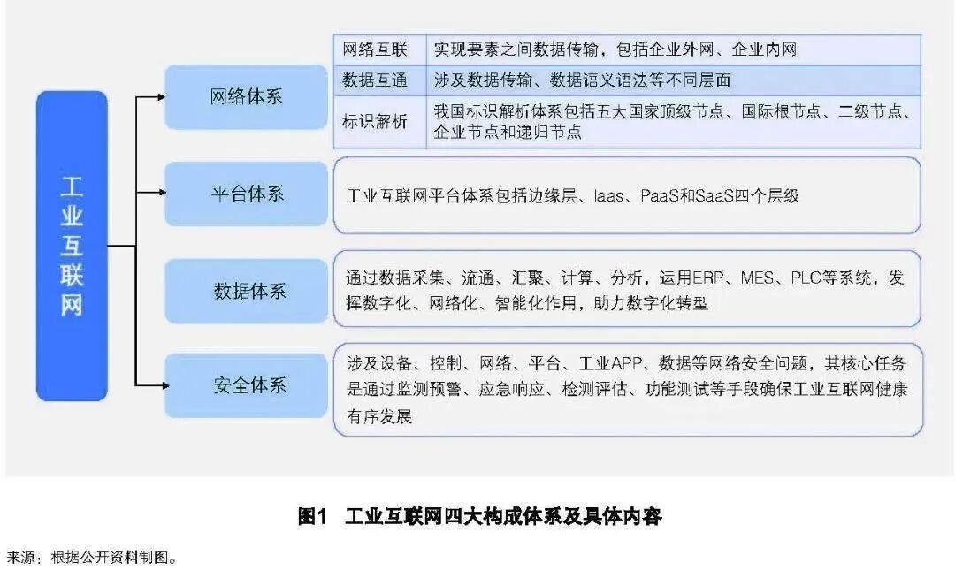 工业互联网四大构成体系中,网络是基础、平台是中枢、数据是要素、安全是保障(见图1)。通过此四大体系,实现对人、机、物的全面连接与融合,进而变革传统制造模式、生产组织方式和产业形态,构建起全要素、全产业链、全价值链、全面连接的新型工业生产制造和服务体系。