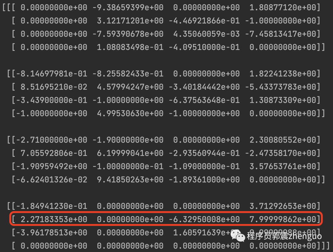 Q表如下所示,可以看到红框所示为下面粉丝网格的Q值,第三个元素就是向左的奖励值,看到是最低的,因为是墙体。