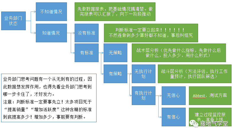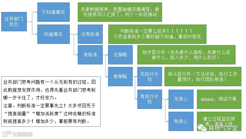 答:主导权不一样。业务部门问了建议,可以直接去落地。数据部门只是个辅助,说的话如果不对业务胃口,就永远悬在天上。就像开车,抓方向盘的人听了建议能换路线,坐副驾驶的哔哔太多,很容易遭嫌弃。所以提问人不同,应对思路是不一样的。今天我们先讲业务来提问。