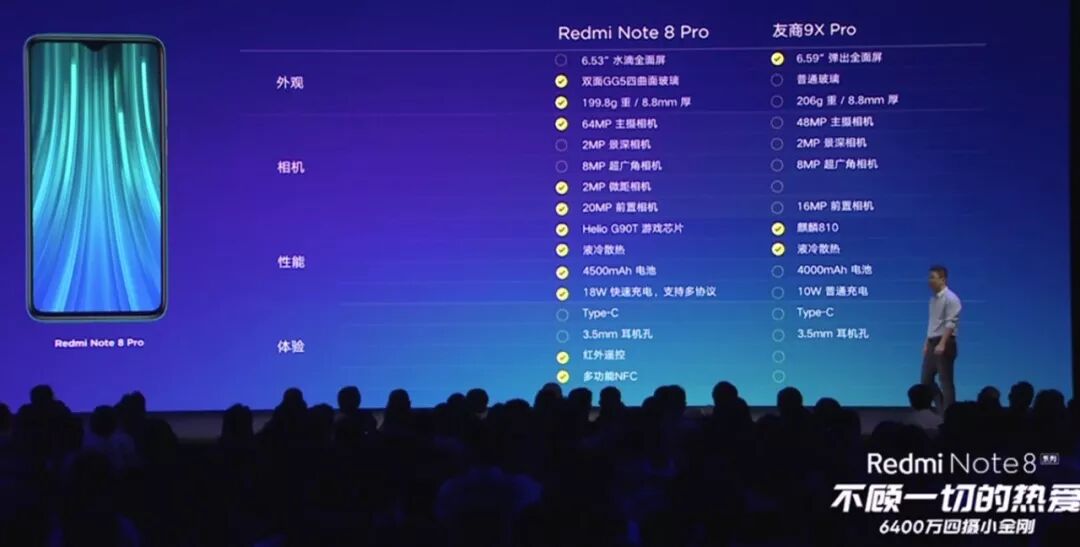 核心配置上,Redmi Note 8 Pro搭载联发科G90T处理器,“冰封”液冷散热,(只比友商热一点...),4500mAh,标配18W快充头,卢伟冰吐槽荣耀9X的10W快充实际充满和充至100%的时间差距大,是“UI快充”。(这点小白测评数据库有明确对比各家手机的“从0充至100%”和“完全充满”2个榜单,有详细说明。)