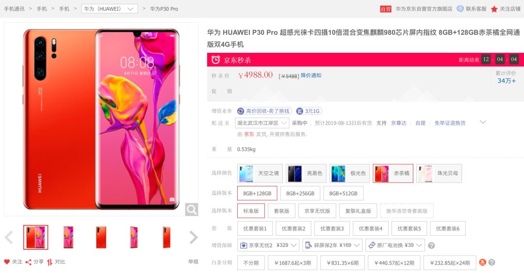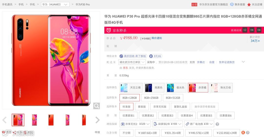 而今天最激动人心的降价应该还是华为P30系列,其发布于4月11日,P30和Pro版分别是3988/5488起售,现在京东自营平台开启了促销活动。