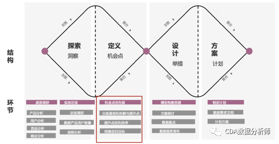 机会点优先级在数据应用产品设计框架中属于目标定义阶段,主要环节可分为北极星指标拆解与提升点、提升点优先排序、明确项目目标。