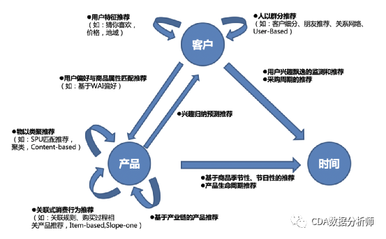 从产品角度出发,就是以物品的信息作为特征,找到对应的用户群,进行精准营销。主要有物以类聚的推荐、关联式消费行为推荐、基于产业链的产品推荐。