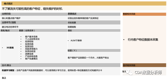 数据服务画布从业务痛点、环节流程、用户触达、技术算法、相关风险进行展示,可以系统地反映企业、用户、产品、行业内竞品和服务供应。