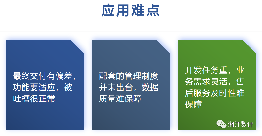 2.系统上线后相关配套的管理制度并未出台,导致系统在应用时数据的规则标准、及时性、完整性、准确性难以保障,导致数据分析应用难,数字化管理失去管理价值;这是系统运营管理的问题,也是应用难的最大问题;