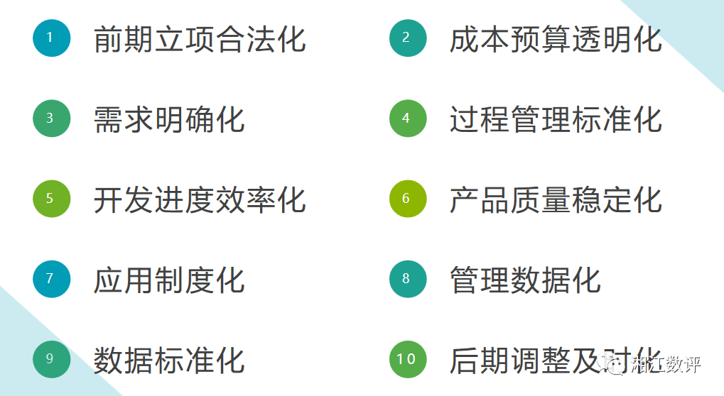 老杨认为开发团队要从制度、成本、过程、效率、服务等十个方面做到如下: