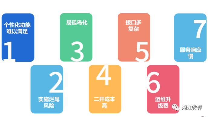 购买第三方软件并不能满足全部应用需求,千企千面,还有一点企业的业务是不断变动的,而软件代码是预先设定不可移动的,所以企业需不断对软件功能进行调整,以满足当前业务需求,也就是二次开发,这一切需要费用,不断的投入;而一旦使用某软件产品一段时间,产生大量数据后,主动权并不在企业,要么接受软件公司的报价方案,要么换产品,而更换系统的风险及时间方面的投入远远大于二次开发,所以企业只能被动接受,鸡肋感满满;