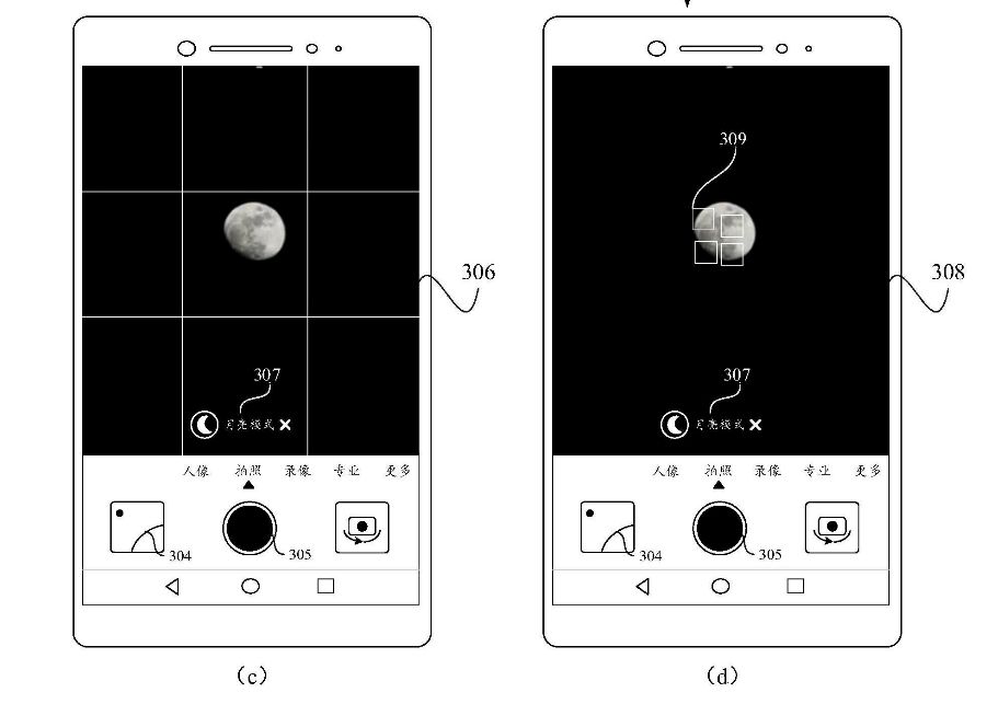 专利显示,华为拍月亮方案通过在预览界面中自动识别月亮,并在识别到月亮之后进入月亮拍摄模式,从而自动对焦月亮,使预览界面中显示轮廓清晰的月亮图像。