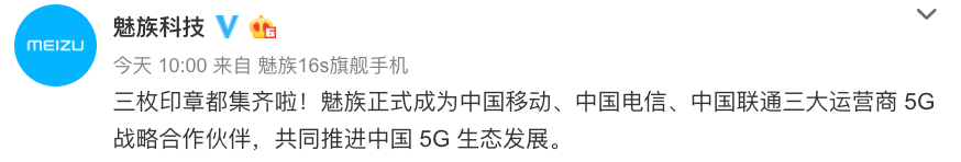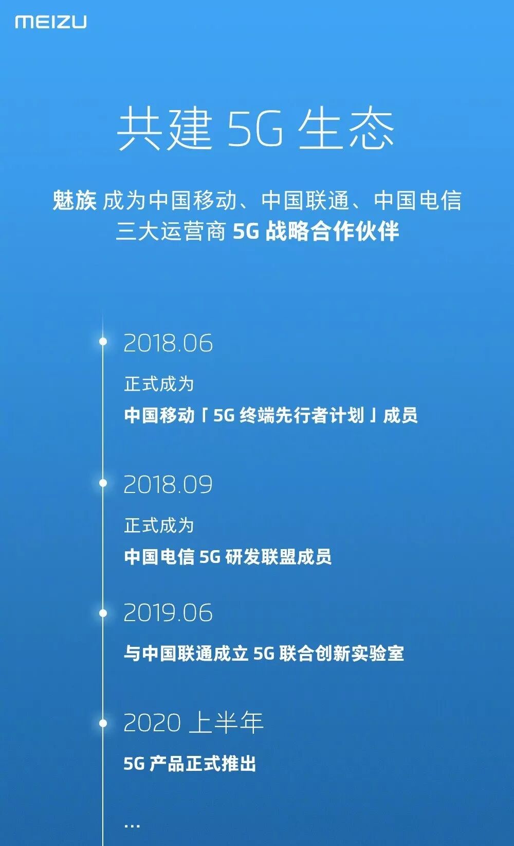 官方表示,魅族今年才正式拿下三大运营商的5G战略合作,在今日华为中兴OV等纷纷宣布拿到入网许可证/获得3C认证时,魅族不急不慢:2020年上半年第二季度正式推出5G产品