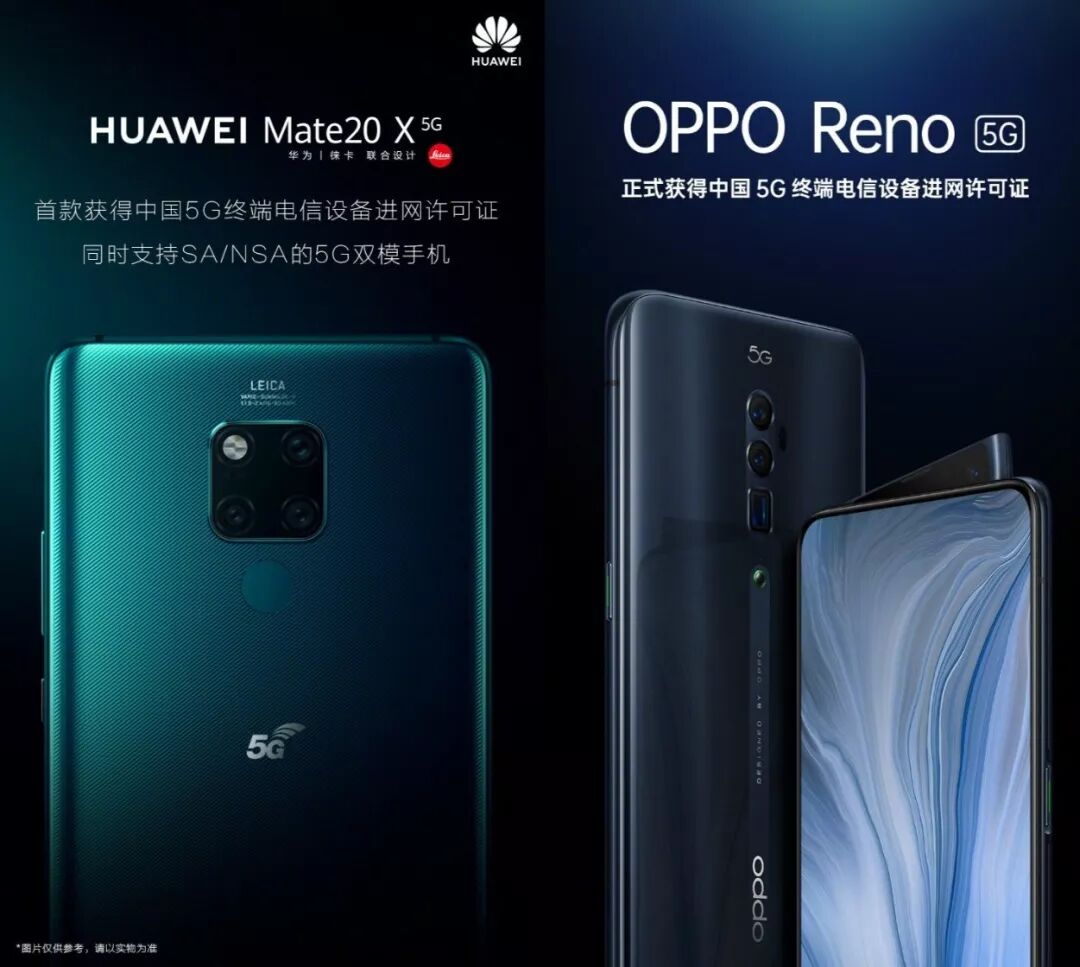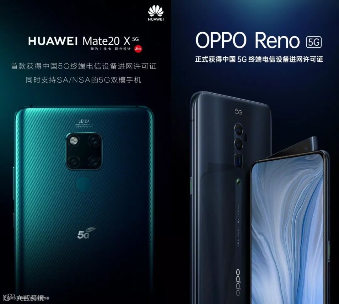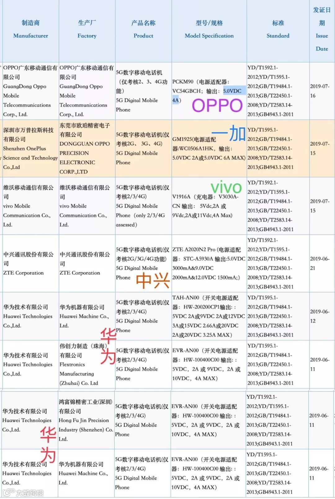 获得3C认证的5G手机 从下到上分别为:华为Mate 20X 5G版、Mate X 5G折叠屏、中兴天机Axon 10Pro 5G版,iQOO 5G版(44快充),一加7Pro 5G版(30W快充),OPPO Reno 5G版(20W快充),其中华为共2款设备,型号为EVR-AN00的华为Mate 20X 5G版交给了三家代工厂,所以一共出现了8个。
