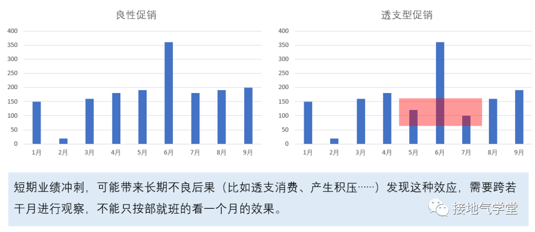 注意!在内部行动评估上,要注意完整性和全面性。比如做促销活动,可能有拉动效果,也可能是透支了用户未来的消费,所以要持续跟踪一段时间,关注真实结果(如下图)。