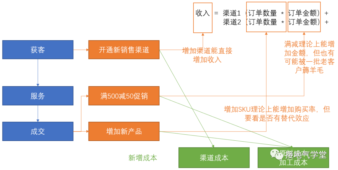 但是更多情况下,外部因素没有那么夸张,这时候就得聚焦到内部行动上。内部行动,需要理清楚:每个行动,对收入/成本有什么影响,到底以何种方式改变收入/成本指标。有些行动能直接提升收入,有些则是间接辅助作用,有些干脆没啥作用。因此,梳理内部行动,区分对收入/成本作用,是很关键的(如下图)。