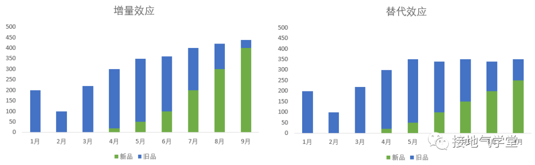 比如上新产品,可能提高总销量,也有可能仅仅是替代了某个旧产品销量,总销量没啥变化(如下图)。