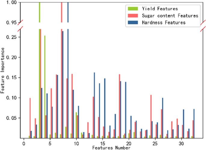 图2:与产量,含糖量和硬度相关的特征变量的重要性顺序