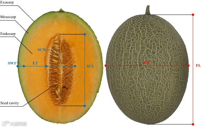 每个完整样品采集3次,权重指数取平均值。取种子腔和内果皮边缘处的含糖量值,各取一半样品3次,取平局值。在内果皮中央采集硬度值,左右两侧同时采集各半样,取平均值。瓜果由花托和子房发育而成。果实可分为果皮和种腔。果皮由外果皮、中果皮和内果皮组成,中果皮和内果皮没有明确的界限。两者均由富含水和可溶性糖的大型薄壁细胞组成。形状指标用游标卡尺测量相应的位置指标。