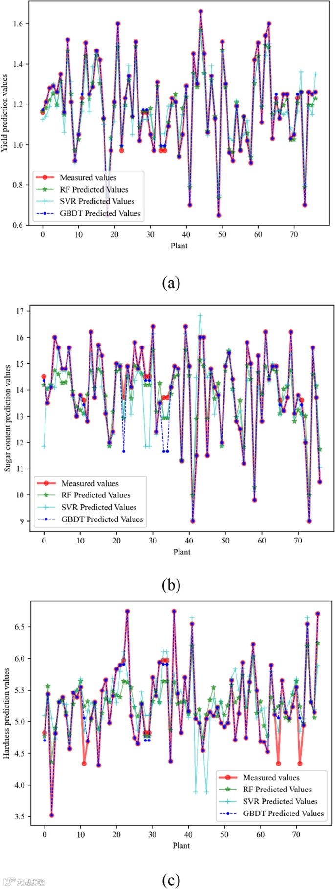 图5: 以降维特征为输入,不同模型的产量(a)、含糖量(b)、硬度(c )预测结果对比。