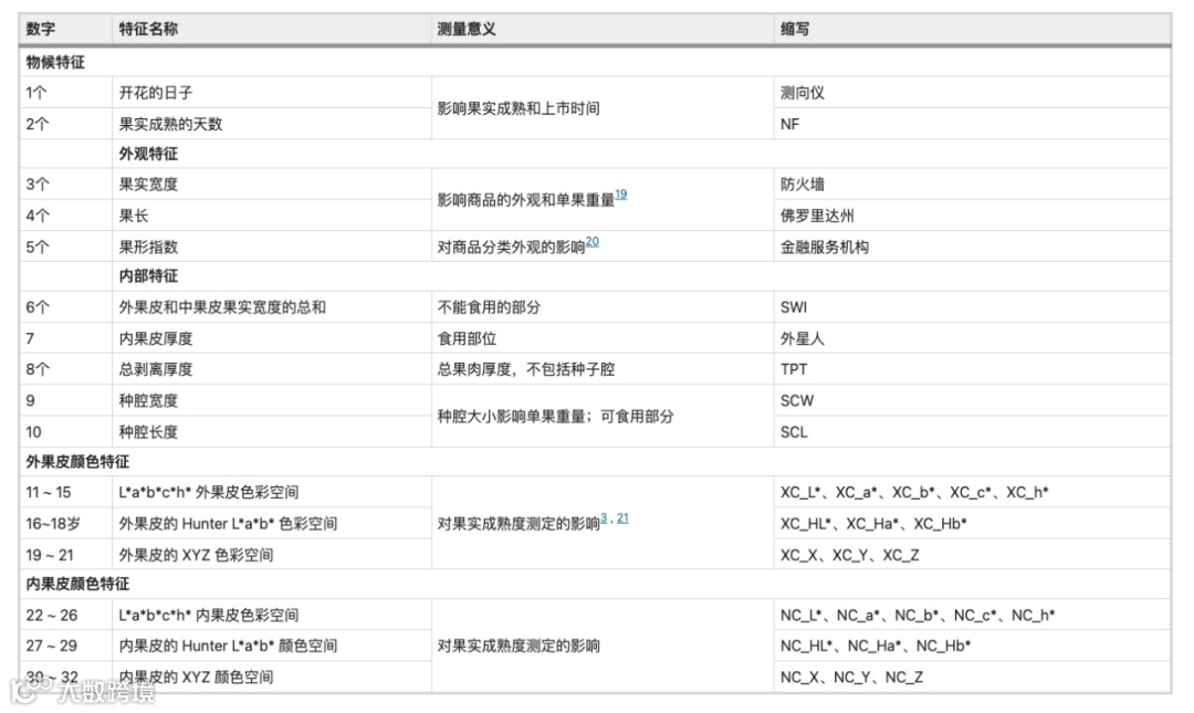 本文记录了甜瓜生长过程中果实物候特征、形状特征(包括外观和内部特征)、颜色特征(包括外果皮和内果皮颜色特征)的数据。GBDT算法用于分析和预测影响甜瓜果实产量、糖度和硬度值的特征的重要性。综合比较了支持向量回归(SVR)和随机森林(RF)这两种经典回归模型的预测性能和结果。并且比较了模型在所有特征变量和仅减少特征变量时的预测结果,使得模型可以更好地应用于现场的无损检测任务。