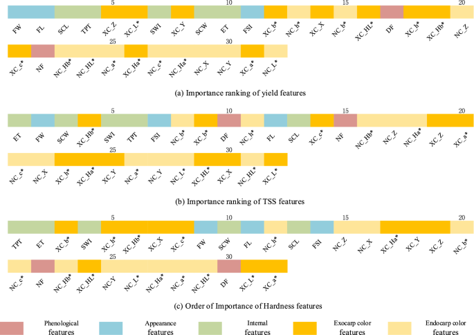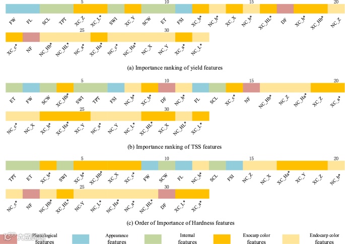 根据三个目标特征变量和类别的重要性进行重要性分析。对于产量:果实宽度 (FW)、果实长度 (FL)、种子腔长度 (SCL)、总果皮厚度 (TPT) 以及与内果皮和种子腔相关的内部性状参数对产量具有决定性作用。对于糖含量,参数内果皮厚度(ET)、种子腔宽度(SCW)、外果皮和中果皮果实宽度之和(SWI)和总果皮厚度(TPT),这些参数与可食部分的大小有关果,关系密切。对于硬度,内部特征总果皮厚度(TPT)、内果皮厚度(ET)、外果皮和中果皮果实宽度之和(SWI)和外果皮颜色特征对硬度指标有显着影响。与产量和硬度相比,物候特征对含糖量的影响更为关键。颜色指标中,与外果皮黄蓝色特征空间相关的XC_Hb*和XC_b*与含糖量和硬度均显着相关,外果皮颜色对所有三个指标的重要性均高于内果皮颜色。
