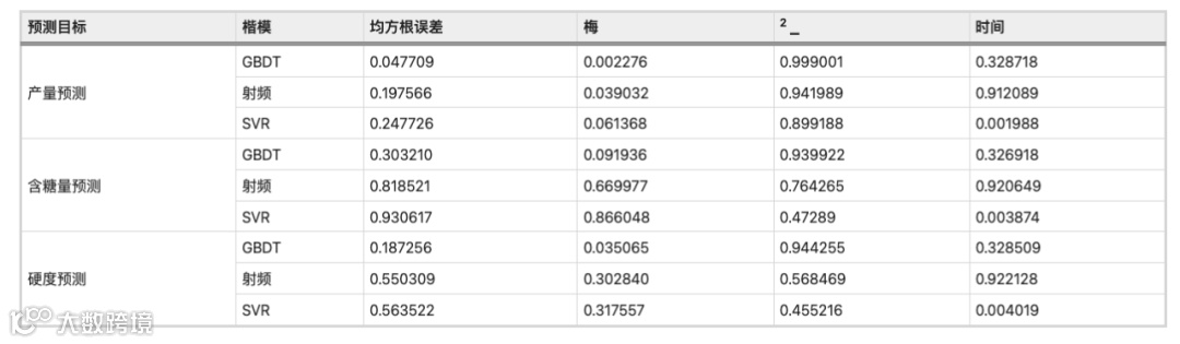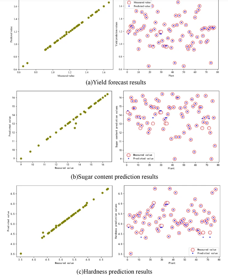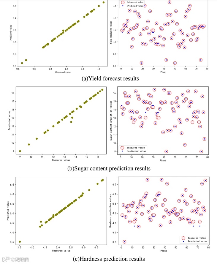 痛点:对影响甜瓜产量和质量的特征进行相关分析和预测可以促进农民或植物育种者的早期决策,或使生产者能够在作物收获前预测融资。本研究还比较了模型在使用所有特征变量和仅使用缩减特征变量时的预测效果。本文提出的GBDT预测模型以约简特征为输入对甜瓜产量、含糖量、硬度进行预测,模型R2可达90%以上。