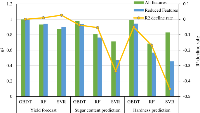 如图6所示,通过比较三个模型以所有特征变量和降维特征变量为输入的R2指标,可以看出GBDT模型对产量预测的R2高于特征前后的糖度和硬度模型减少。在使用三种不同模型预测产量时,与所有特征变量作为输入相比,减少特征的使用提高了模型的 R2。相反,减少特征作为输入降低了所有三个预测模型预测糖分和硬度的R2,SVR模型预测R2显着降低超过30%。它与前面讨论的预测模型中所有特征变量的重要性有关,其中减少的特征大多位于产量预测模型中变量重要性排名的顶部,FW 和 FL 在特征重要性得分中接近 100%。相比之下,含糖量和硬度预测模型中更多的内部特征,如 ET、TPT 和 SCW,具有更高的重要性分数。添加一些内部水果措施可以进一步提高糖度和硬度的预测准确性。