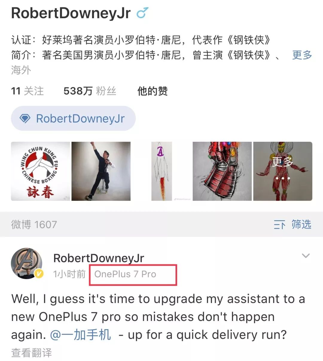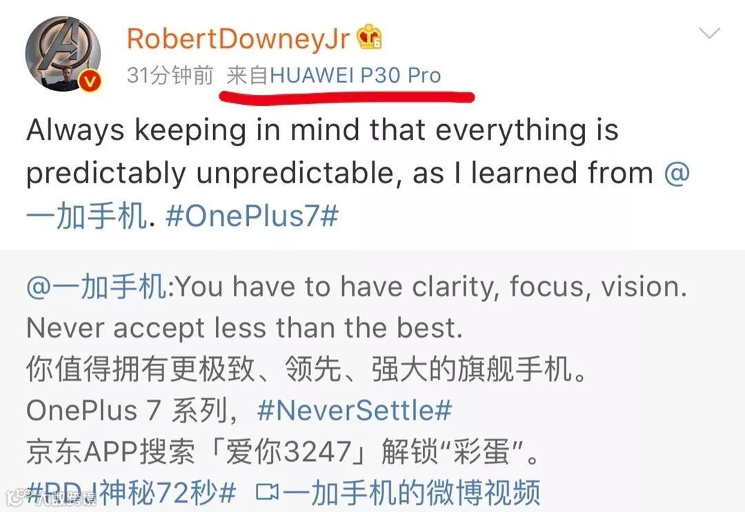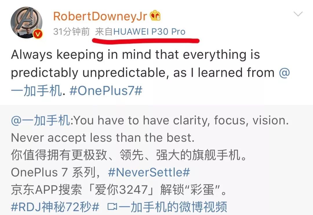 今年一加手机请了复联系列电影中的经典角色 钢铁侠 扮演者 小罗伯特 · 唐尼 做一加7系列的代言人,然而尴尬的是,前天下午小罗伯特的微博账号转发一加手机广告时,来源竟是华为P30Pro,对此,唐尼今天下午发文回应。