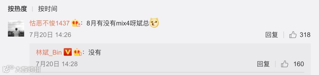 有网友问林斌:“8月有没有小米MIX 4?”林斌的回复是:“没有”。虽说有些失望,但按照常规发布时间来看,这段时期新旗舰要么8月发,要么就是10月以后,因为要避开9月份的iPhone,这么一看MIX 4最早也得10月份发布了