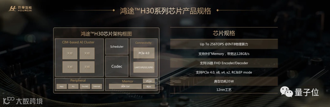 这款12nm芯片名叫鸿途™H30,从性能表现上来看,在功耗仅为35W的情况下,最高物理算力可达256TOPS。