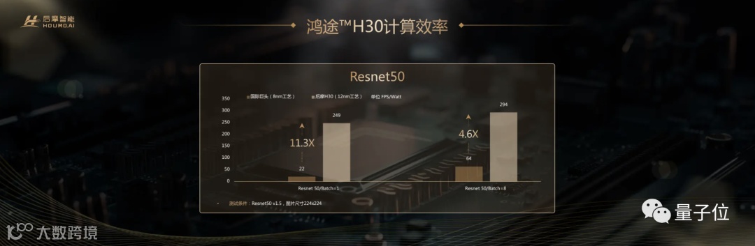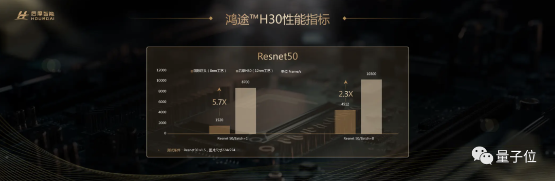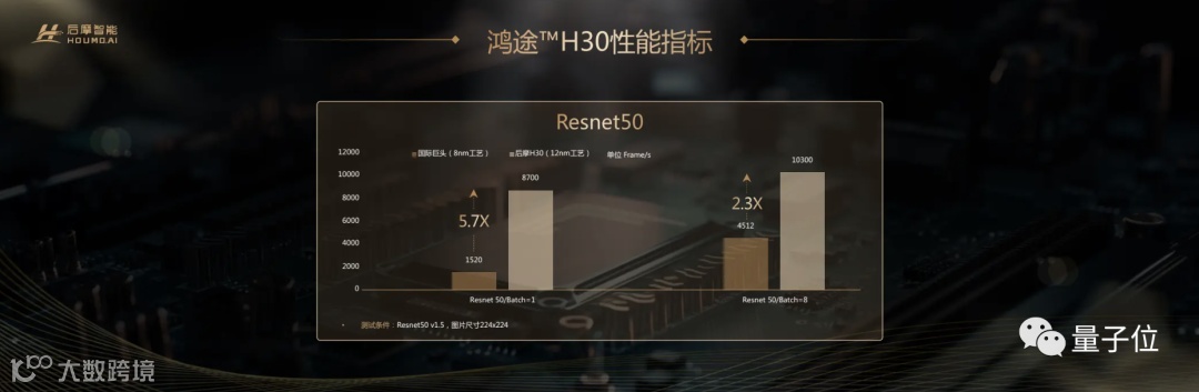 性能指标方面,鸿途™H30与英伟达产品相比,在Resnet50 Batch=1和Batch=8上,分别达到了5.7倍和2.3倍。