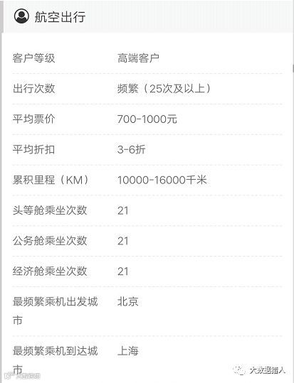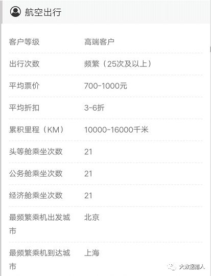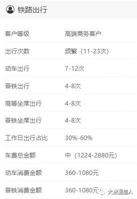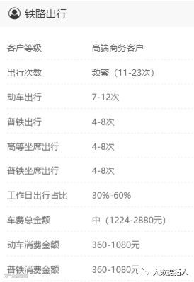 出行频率+目的地:出行频率高的,目的地基本一样的,基本是商务出行,且属于高端商务了,业务稳定的;出行频率高,但目的地经常变换的,大部分是开拓市场的或者是经常出游的。