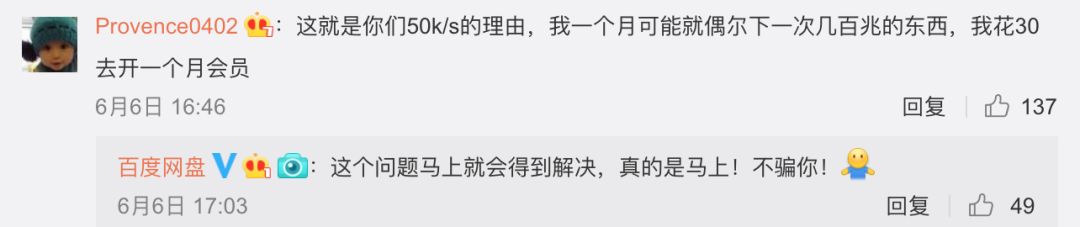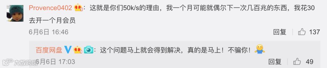 很多小伙伴都会使用百度网盘来存储视频、文件、照片等资源,但是当你使用百度云下载文件时,只要不是会员,无论是WiFi还是4G又或者是现在已经开始内测的5G,都摆脱不了几十KB/秒的乌龟般下载速度,于是早在6月就有网友发文向消费者协会控诉,但最终百度云给出了一个口头承诺“会解决”,现在终于等到。