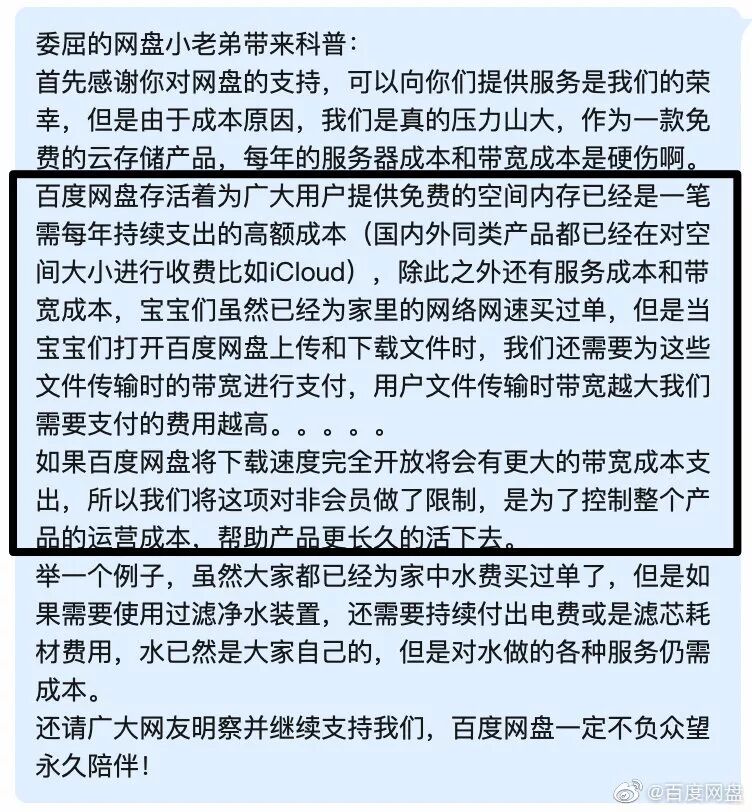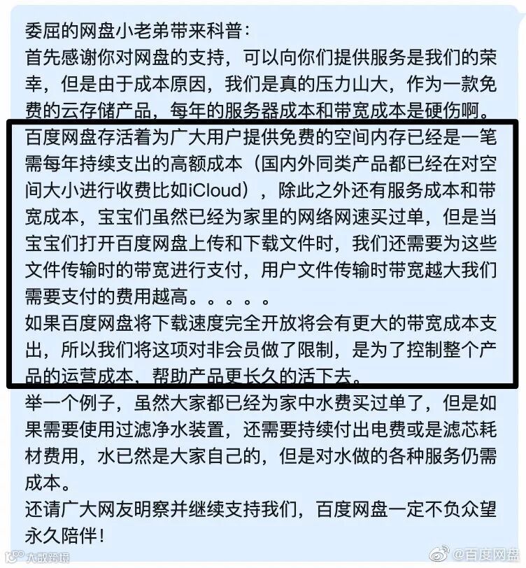 至于不开会员百度云下载速度就龟速,百度网盘官方回应称,作为一款免费的云存储产品,每年的服务器成本和带宽成本是硬伤。对非会员作出限制的原因是为了控制产品的运营成本,帮助产品更好地活下去。