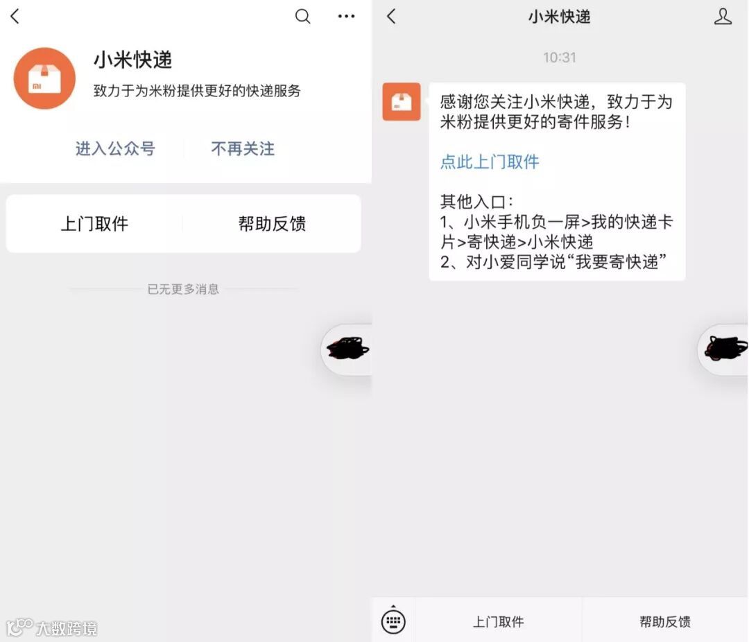 在微信公众号搜索「小米快递」可以看到「小米快递」支持上门取件服务,不过看了下,小米快递是和其他物流公司合作,并不是自营物流,主推为米粉服务。目前可选快递主要有顺丰和韵达两个。