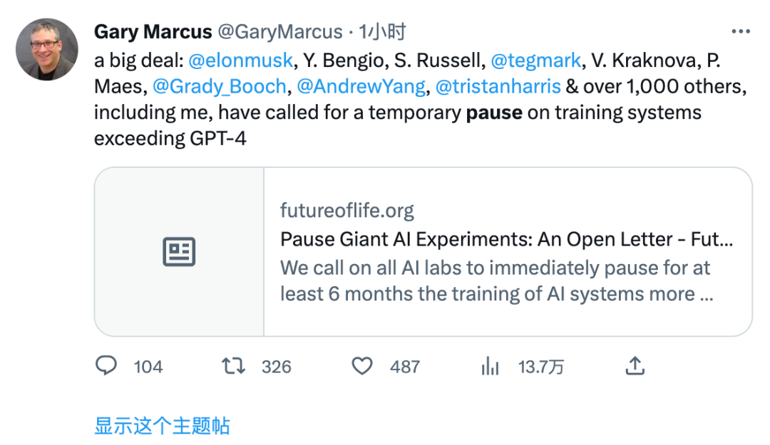 公开信链接:https://futureoflife.org/open-letter/pause-giant-ai-experiments/