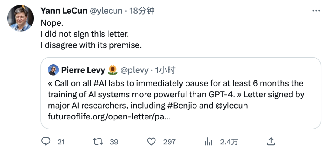 不过一直抨击ChatGPT的Yann LeCun公开表示不会签署这个公开信,不同意这封公开信的内容。