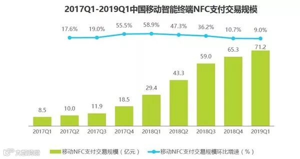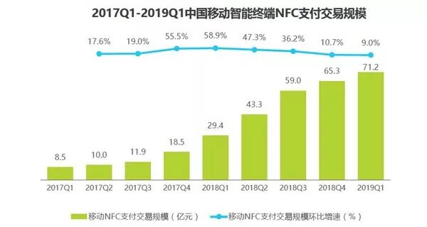 另外,该市调机构还给出了移动智能终端NFC支付的数据,显示NFC交易规模达71.2亿元,相比整个移动支付虽然占比很低,但增速迅猛,高达142.2%。虽然目前生活中像使用公共交通乘坐地铁时,看到的大多数人还是会选择支付宝微信二维码支付,NFC用的并不多,但应该也是大趋势之一。