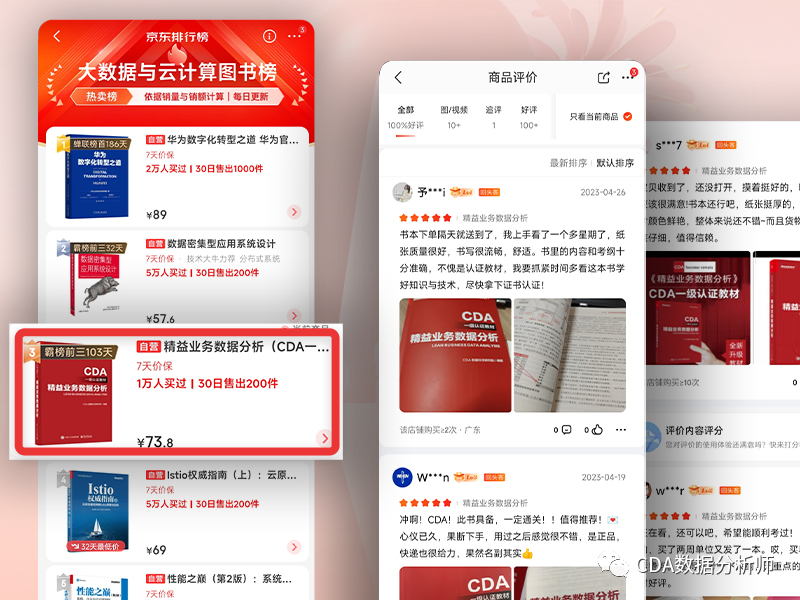 今天给大家推荐的书籍是2023版数字化人才认证 CDA 一级备考教材——《精益业务数据分析》,由CDA 数据科学研究院编写。本书自出版以来,受到各大高校名企、专家、从业者的高度关注,在京东大数据与云计算榜单中,持续霸榜前三已超3个月,重印10余次,累计销量超过万册。